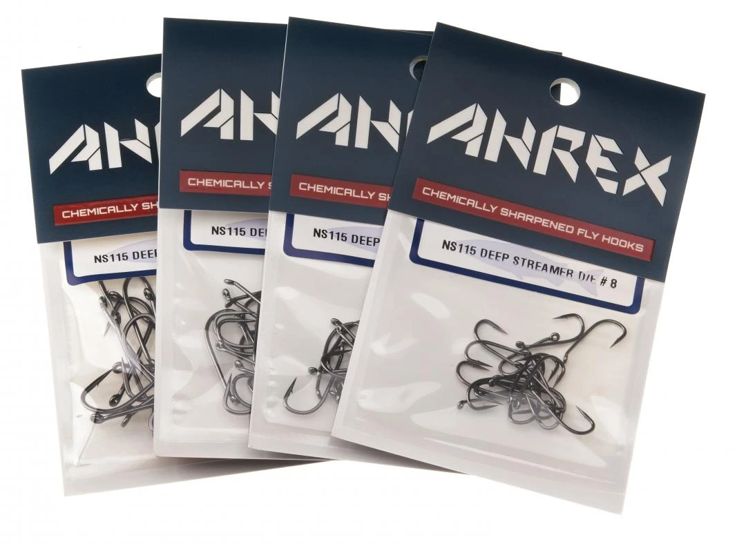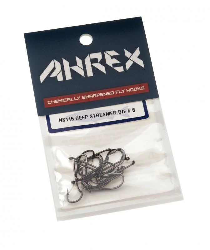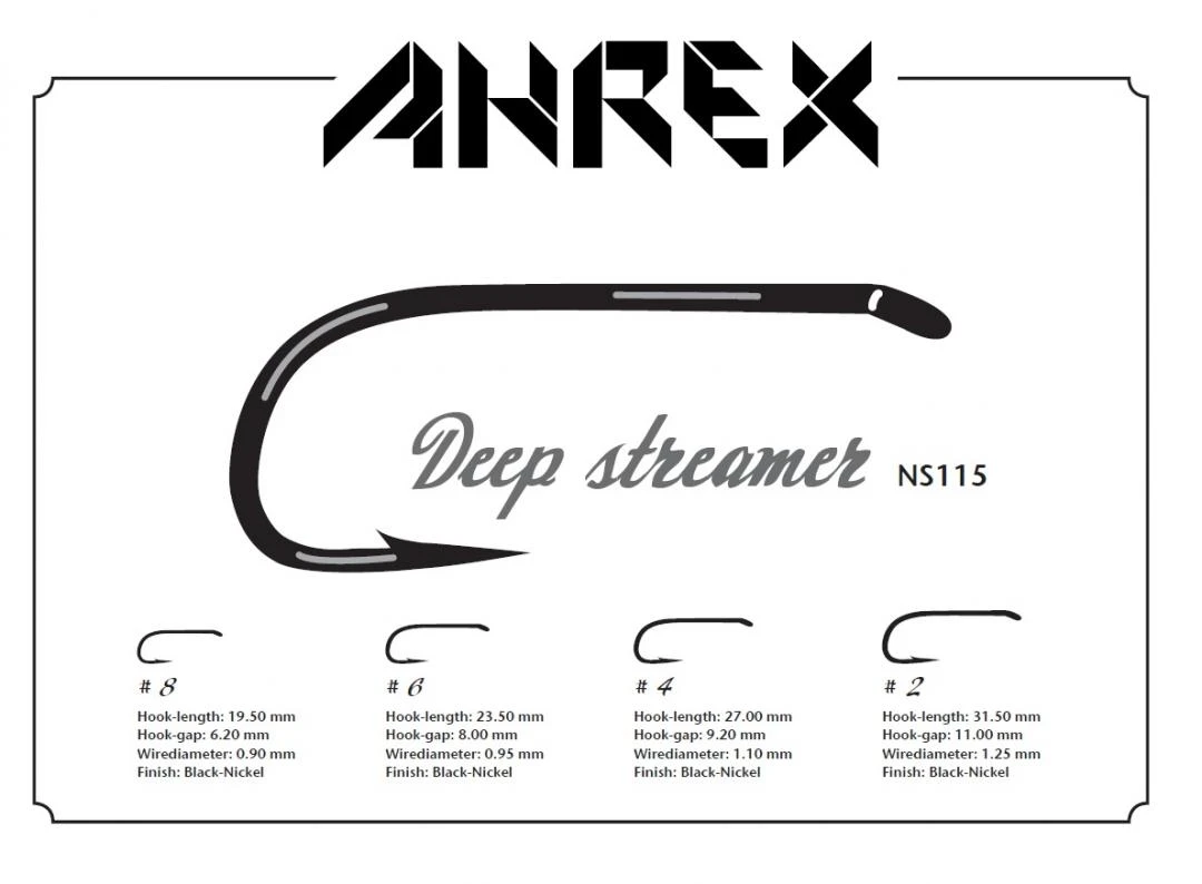 De Ahrex NS115 Deep Streamer Hooks zijn stevige streamerhaken met een neerwaarts gebogen haakoog. De haken zijn specifiek ontworpen voor grote vissen en diepere wateren. De NS115 werkt goed voor vliegen met dumbbell ogen of kettingogen, die op of vlak boven de bodem gevist worden.