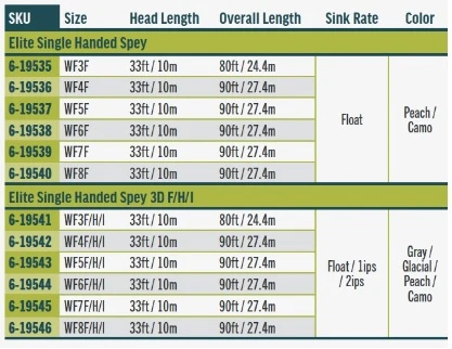 De RIO Products Elite Single Handed Spey 3 D Fly Line is ontworpen door RIO Products als een hulpmiddel voor vliegvissers die Spey en rolworpen willen uitvoeren met een eenhandige vliegenhengel. De achterwaartse gewichtsverdeling van de RIO Products Elite Single Handed Spey 3 D Fly Line laadt de vliegenhengel diep in de krapste ruimte en stelt de vliegvisser in staat om lange en moeiteloze worpen te maken met obstakels dicht achter zich. De nieuwe F/H/I versie van deze vliegenlijn heeft een coating met een drievoudige densiteit (float/hover/intermediate), die perfect is voor het laten rondgaan van Intruders door snelle, ongelijke stromingen, of voor het strippen door stromingen voor bruine forellen in de herfst. De multi-densiteit coating zorgt er voor dat de vlieg beneden blijft, maar het toch gemakkelijk maakt om de vliegenlijn te menden en optimaal te controleren.