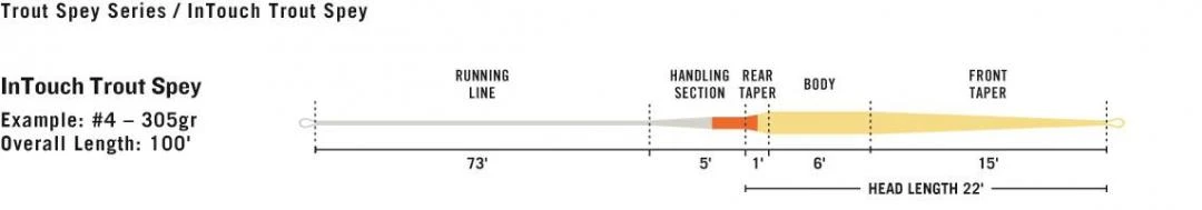 De RIO Products InTouch Trout Spey Fly Line is een zeer eenvoudig werpen, korte buik stijl vliegenlijn voor vliegvissers die graag werpen en vissen met lichte tweehandige forel Spey vliegenhengels, maar ze zijn ook prima te gebruiken op eenhandige vliegenhengels (pas gewoon het lijngewicht aan aan het opgegeven werpvermogen van de vliegenhengel). Elke RIO Products InTouch Trout Spey Fly Line is gebouwd op RIO’s ultra-low stretch ConnectCore voor maximale gevoeligheid, en is gebouwd met een naadloos geïntegreerde volglijn voor gebruiksgemak. Vliegvissers kunnen gewone leaders, 10/15 voets Replacement Tips of Versileaders aan de voorkant bevestigen en deze vliegenlijnen zijn perfect voor nimf en indicator montages, soft hackles en kleine streamers.