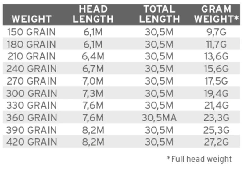 - 240-300 grains/15.6-19.4 gram – 8’/240 cm TC Tips
