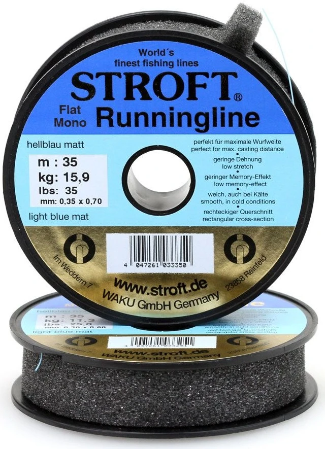 De Stroft Flat Mono Runningline is een monofilament lijn voor gebruik achter een schietkop vliegenlijn met een platte, rechthoekige doorsnede. De Stroft Flat Mono Runningline biedt de beste schieteigenschappen. Door de kleinere diameter en aanzienlijk minder wrijving zijn deze lijnen qua werpafstand duidelijk superieur aan gecoate volglijnen. Deze running lijnen hebben een optimale soepelheid en zijn gemakkelijk te strekken.
