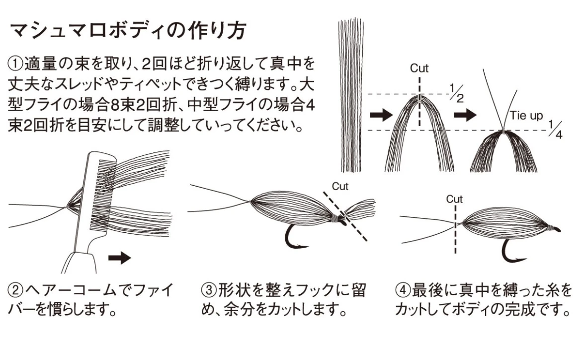 Shimazaki Marshmallow fibers are ideal for making marshmallow body flies and parachutes. Hollow structure polypropylene, lighter than water and water repellant.