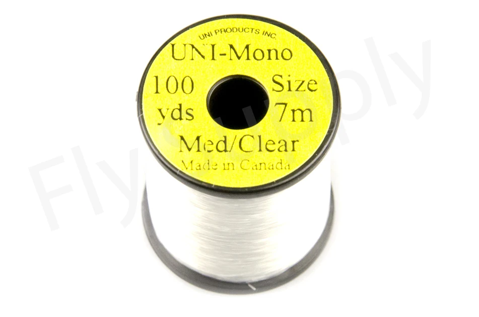 De Uni Mono Medium Clear 100 yds is een fraaie, transparante, nylon binddraad, ideaal om mee te ribben en als binddraad voor het binden van medium formaat (zoutwater) kunstvliegen en streamers.