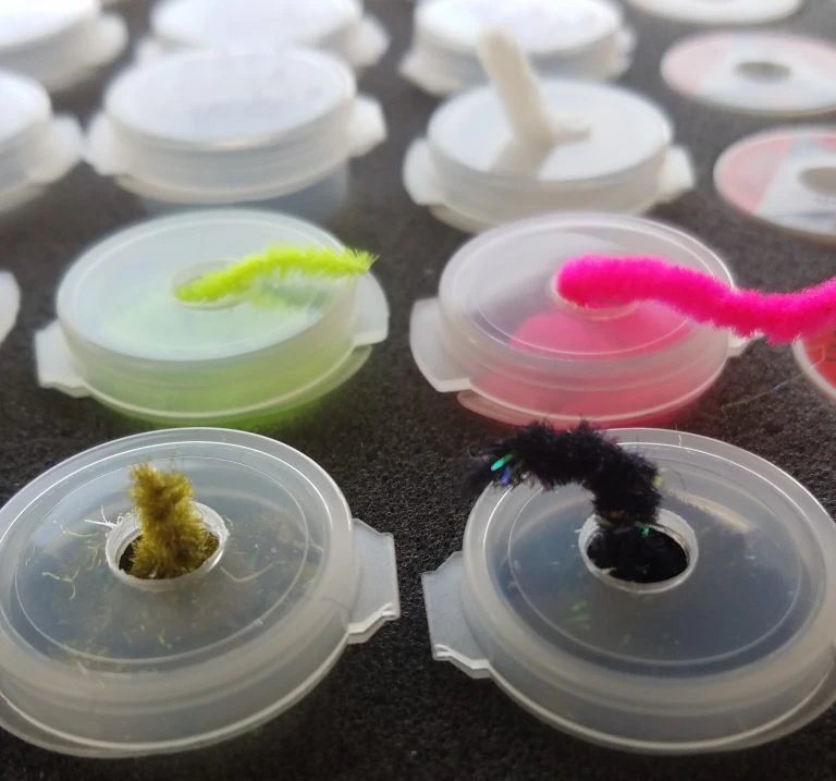 De stevige deksel is eenvoudig te openen en er kan eventueel een gat in geboord worden om dubbing of chenille door te voeren.