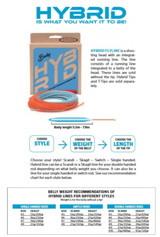 Alle Hybrid tips werken met alle Hybrid, Hammer, TNT, ACE Skagit en ACE Switch schietkoplijnen. Bij het kiezen van de tip kies je alleen de gewenste lengte en densiteit. Je hoeft niet na te denken over het gewicht van de tip, want dat heeft Vision voor je gedaan.